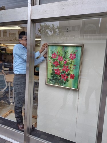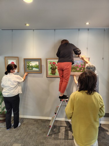 【作品配置中】 ハクビ和紙ちぎり絵学院沼津教室の作品搬入が始まり、沼津店スタッフが設置場所を確認しています。和紙ちぎり絵ならではの繊細な作品を、一つ一つ丁寧に取り扱います。